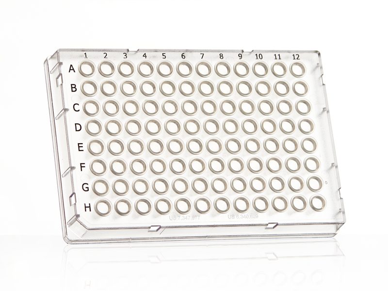 Low profile, 0.1ml polypropylene wells, polycarbonate frame, cut corner H1; working volume: <100µl, total well capacity: 200µl Clear wells, clear frame; 50 plates