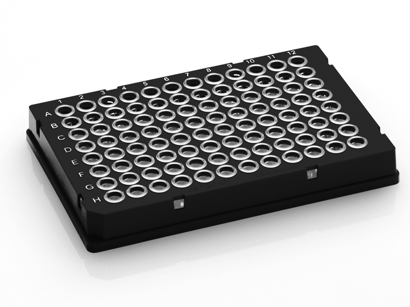 Low profile, 0.1ml polypropylene wells, polycarbonate frame, cut corner H1; working volume: <100µl, total well capacity: 200µl Clear wells, black frame; 50 plates