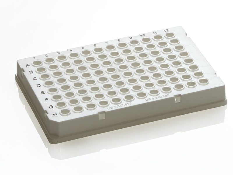 Low profile, 0.1ml polypropylene wells, polycarbonate frame, cut corner H1; working volume: <100µl, total well capacity: 200µl Clear wells, white frame; 50 plates