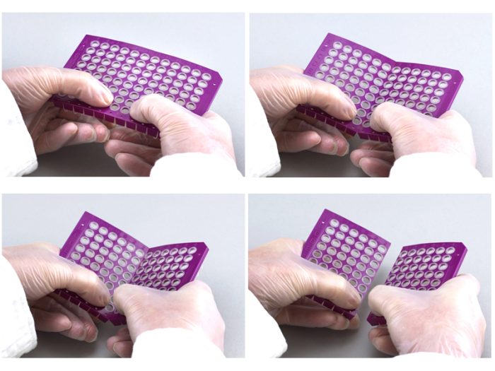 96 well semi-skirted plate, vertically scored, snaps easily into strips of 8 tubes or part plates, cut corner A12; standard profile, 0.2ml polypropylene wells, polycarbonate frame; working volume: <200µl, total well capacity: 300µl