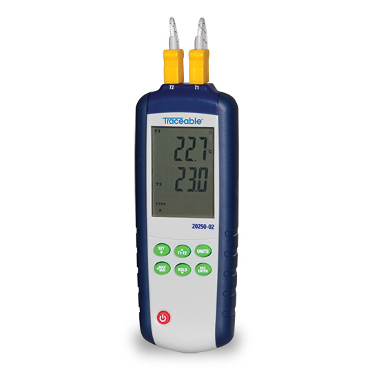 Handheld thermocouple thermometers provide accurate and reliable temperature measurement in an economic and compact design. Features include Min/Max/Avg, Hold, deg. F/ deg. C or Kelvin (K) selectable units, relative time stamp on Min/Max/Avg, electronic off set function and auto power-off to save on battery power. Meters accept both type K or J thermocouple probes with a miniconnector.