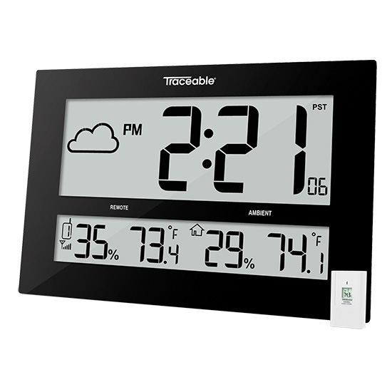 The atomic clock automatically sets correct time and date from signals received from NIST’s atomic clock in Colorado. Select from PST (Pacific Standard Time), MST (Mountain Standard Time), CST (Central Standard Time), and EST (Eastern Standard Time). Signal reception includes four strength levels; RC synchronize process, weak signal quality, acceptable signal quality, and excellent signal quality. Simultaneously view ambient relative humidity and temperature; order clock with remote sensor to also view outdoor relative humidity and temperature.